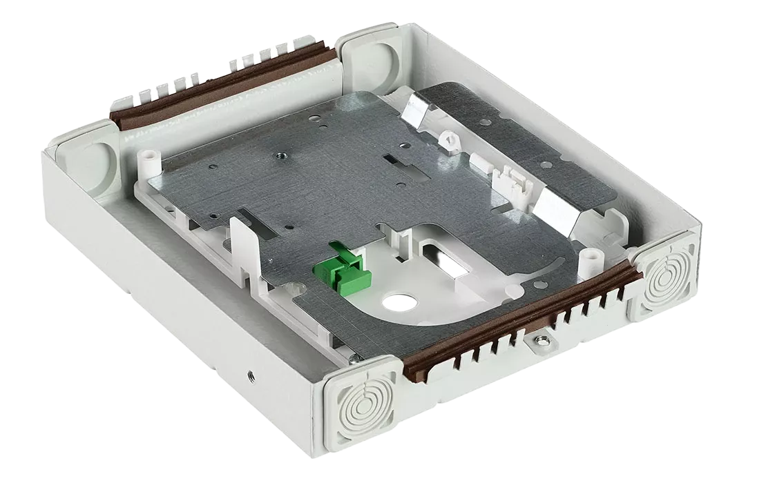Корпус изготовлен из металла и окрашен порошковой краской. Внутри корпуса находится пластмассовая вставка, на которой выкладывается запас волокон пигтейлов, размещаются ложементы для КДЗС и оптические адаптеры для подключения входных разъемов сплиттерных модулей. Зона монтажа ОВ закрывается металлической крышкой к которой крепятся сплиттерные модули. Для ограничения доступа оснащаются винтом-секреткой.