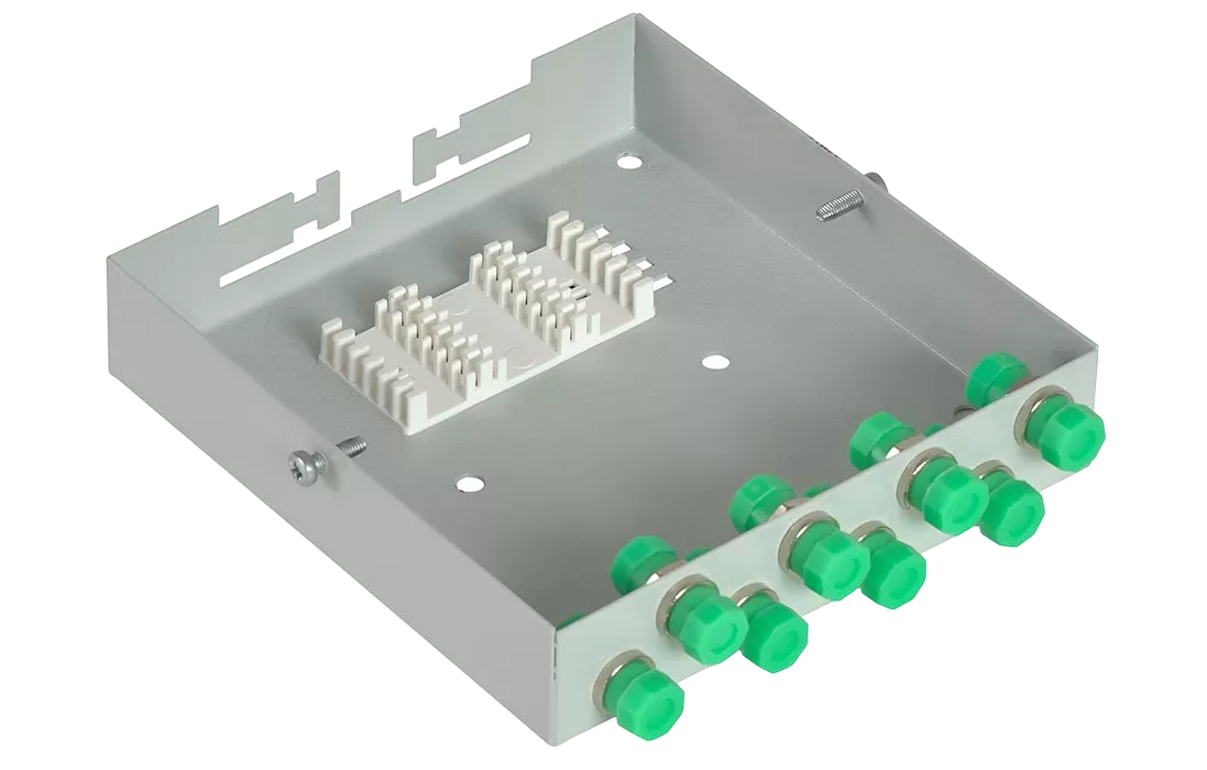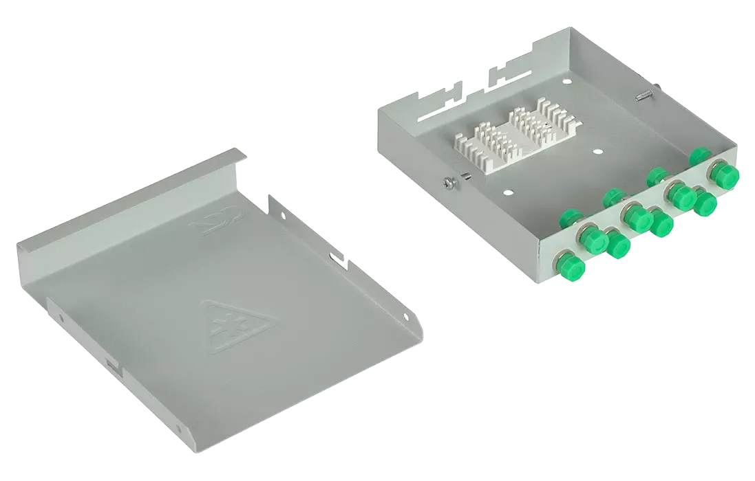 Оптические кабели разделываются и фиксируются в верхней части корпуса. Волокна свариваются с пигтейлами, КДЗС закрепляются в ложементе.