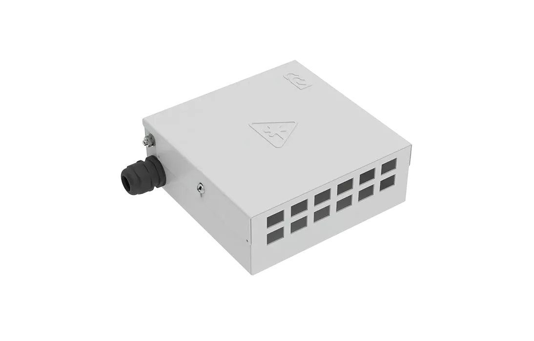 Корпус кросса изготовлен из металла толщиной 1 мм и покрыт порошковой краской цвета RAL7035. Легкосъёмная крышка фиксируется двумя винтами. Оптический кабель можно завести, как снизу, так и сверху. А благодаря разомкнутому контуру на одном из вводов, можно завести оконцованную разъемами кабельную сборку. Внутри кросса расположен сменный ложемент Л12 или Л24, в зависимости от комплектации. Адаптеры устанавливаются в отверстиях на передней панели корпуса.