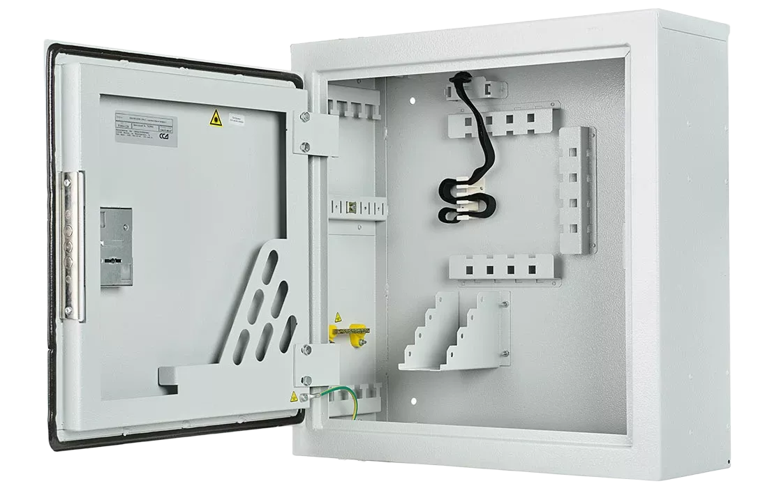 В шкафу предусмотрены несколько монтажных зон. В зоне ввода оптические кабели разделываются и фиксируются. Далее волокна в транспортных трубках поступают в зону монтажа на соответствующий кроссовый модуль. Планарные оптические разветвители устанавливаются в специальные контейнеры на правой боковой стенке шкафа.