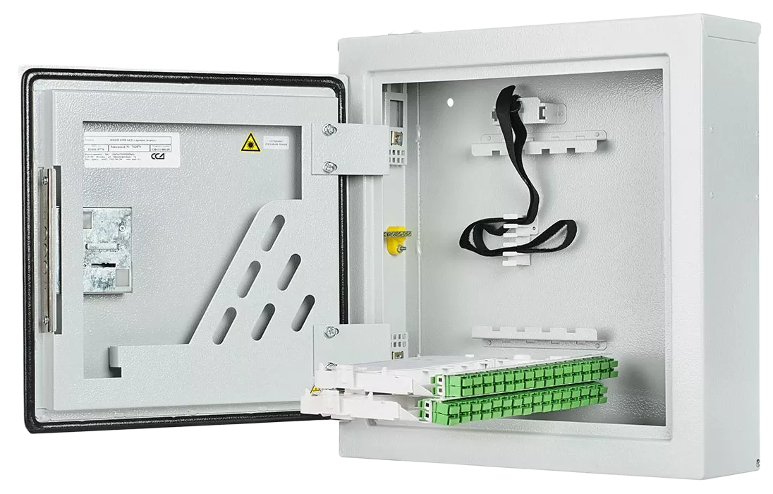 В шкафу предусмотрены несколько монтажных зон. В зоне ввода оптические кабели разделываются и фиксируются. Далее волокна в транспортных трубках поступают в зону монтажа на соответствующий кроссовый модуль. Планарные оптические разветвители устанавливаются в специальные контейнеры на правой боковой стенке шкафа.