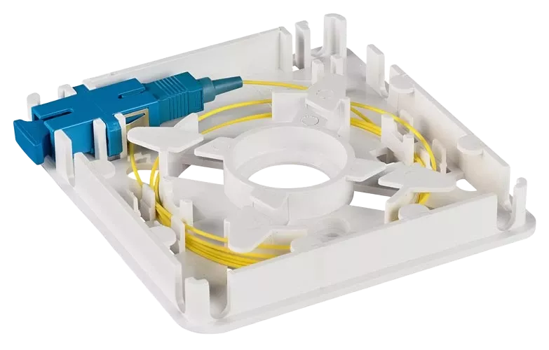 Оптический кабель разделывается и фиксируется на основании корпуса. Волокно сваривается с пигтейлом, КДЗС закрепляется в ложементе. Возможно использование механических соединителей типа Fibrlok. Адаптер устанавливается в одно из посадочных мест на основании корпуса.