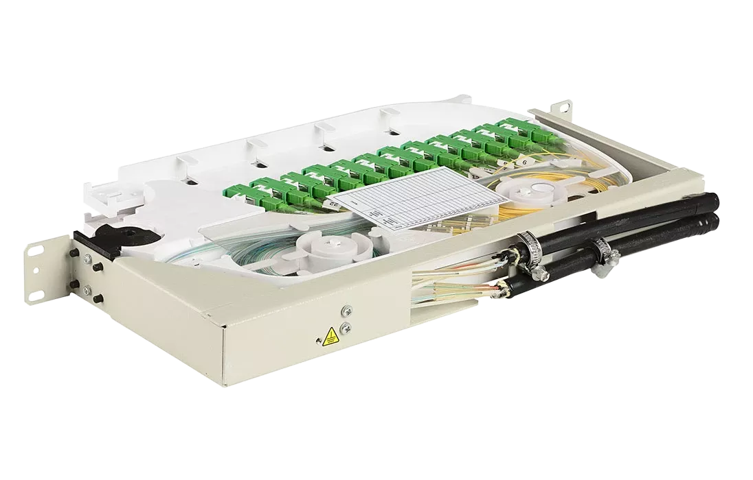 Оптические волокна в модулях поступают от ВКР в защитных транспортных трубках и закрепляются стяжками в узле ввода. Зона монтажа волокон располагается на пластиковых выдвижных полках поворотного типа.