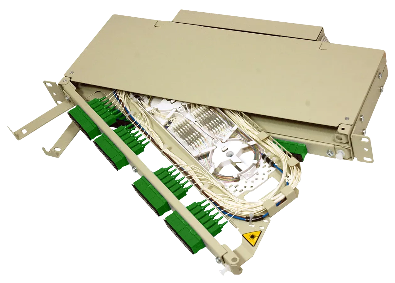 Оптические волокна в модулях поступают от ВКР в защитных транспортных трубках и закрепляются стяжками в узле ввода. Зона монтажа волокон располагается на металлических выдвижных полках поворотного типа, что облегчает монтаж и последующее обслуживание.