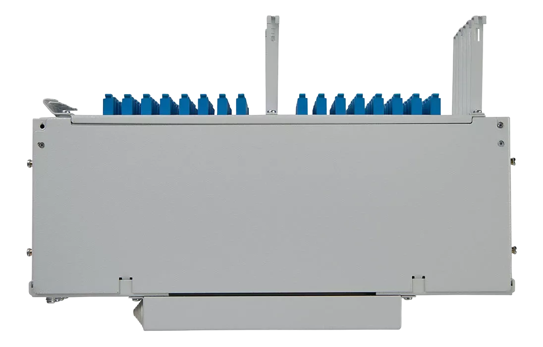 Оптические волокна в модулях поступают от ВКР в защитных транспортных трубках и закрепляются стяжками в узле ввода. Зона монтажа волокон располагается на металлических выдвижных полках поворотного типа, что облегчает монтаж и последующее обслуживание.