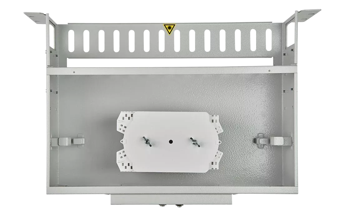 Крепление кабеля по оболочке осуществляется металлическим хомутом и/или нейлоновыми стяжками, на специализированном кабельном вводе, который крепиться на задней стенке корпуса. Центральный силовой элемент ОК крепится при помощи металлической скобы. Сменные металлические планки на 8 или 4 отверстий обеспечивают установку адаптеров-розеток различных типов: FC, SC, ST, дуплекс LC. Комплектуется съемной полкой-органайзером.