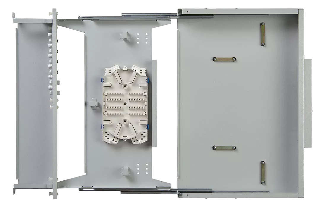 Кросс имеет выдвижную оптическую полку, что облегчает монтаж и последующее обслуживание. Для защиты патчкордов, подключаемых к розеткам кросса, корпус оснащён полкой-органайзером с защитным пластиковым экраном сверху. Подключаемые патчкорды можно вывести через специальные окна с левой и правой стороны кросса.