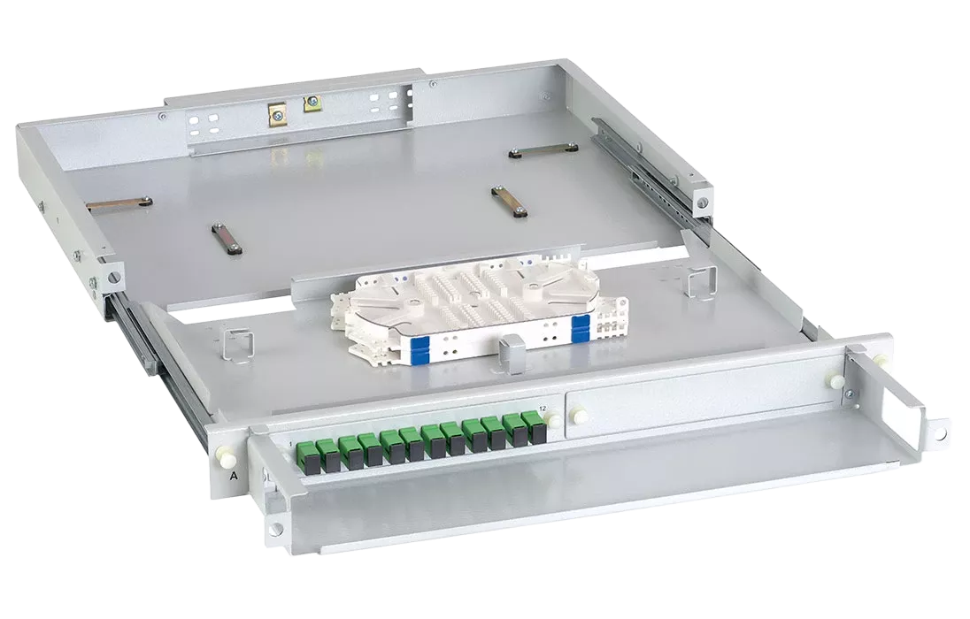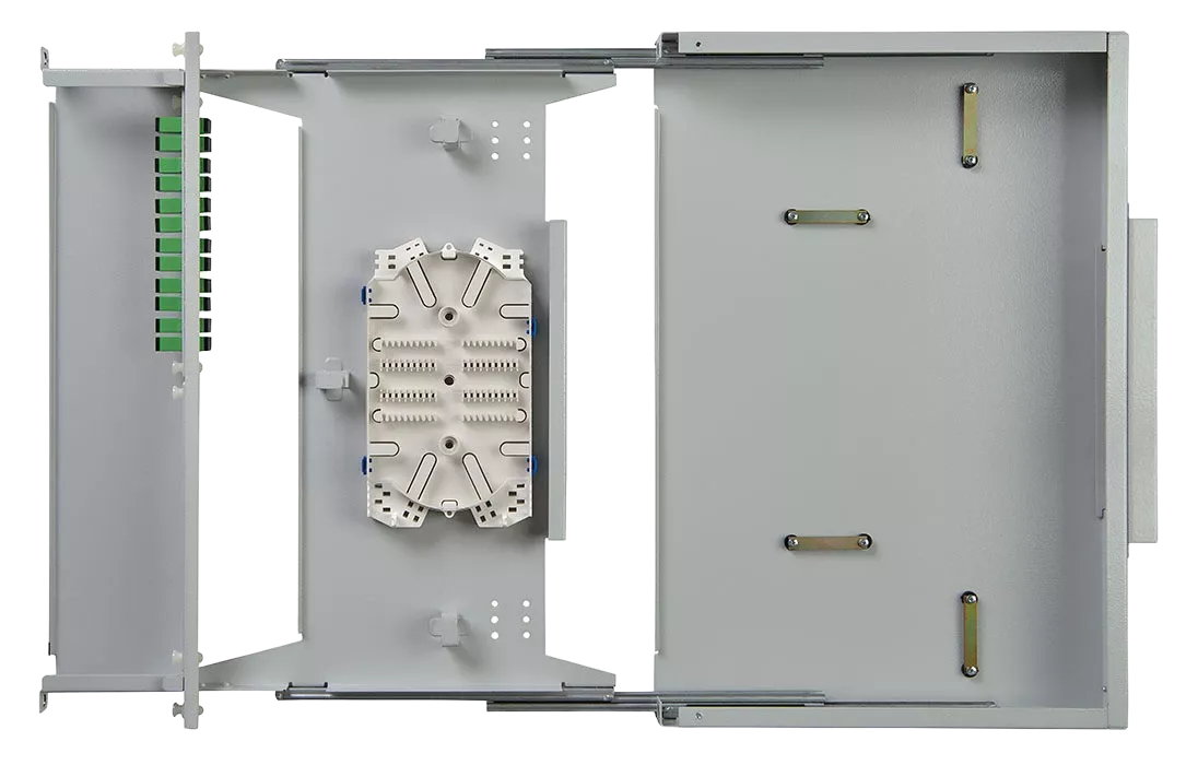 Кросс имеет выдвижную оптическую полку, что облегчает монтаж и последующее обслуживание. Для защиты патчкордов, подключаемых к розеткам кросса, корпус оснащён полкой-органайзером с защитным пластиковым экраном сверху. Подключаемые патчкорды можно вывести через специальные окна с левой и правой стороны кросса.