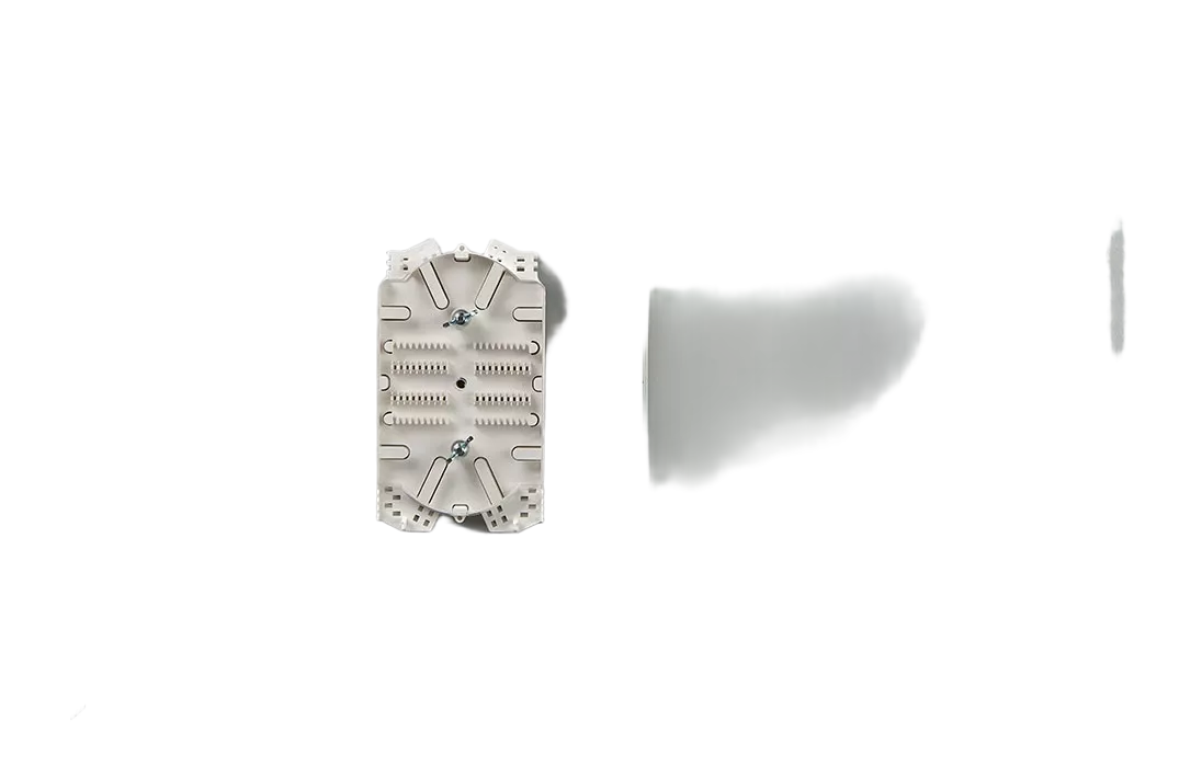 Крепление кабеля по оболочке осуществляется нейлоновыми стяжками, на специализированном кабельном вводе, который крепится на задней стенке корпуса. Центральный силовой элемент ОК крепится при помощи металлической скобы.