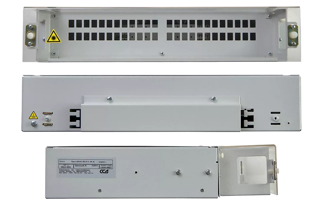 Кросс имеет выдвижную оптическую полку, что облегчает монтаж и последующее обслуживание. Для защиты патчкордов, подключаемых к розеткам кросса, корпус оснащён полкой-органайзером с защитным пластиковым экраном сверху. Подключаемые патчкорды можно вывести через специальные окна с левой и правой стороны кросса.