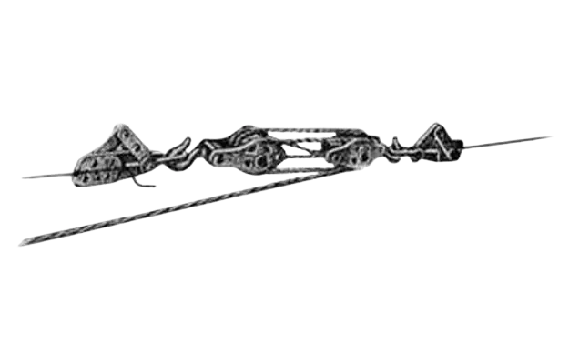 При прокладывании линий связи натяжение провода производится в следующем порядке: в раствор параллельных губок лапки вкладывается натягиваемый провод, ручка лапки надевается на крюк одного из блоков полиспаста. Крюк второго блока закрепляется за неподвижную опору при помощи провода, троса и т. д. Натяжение провода происходит при натяжении свободной ветви полиспаста с усилием. Лапка обеспечивает зажим провода при приложении усилия к ручке. При ремонте линий связи натяжение проводов происходит в том же порядке, с той лишь разницей, что в работе участвует весь комплект -две лапки и два блока.