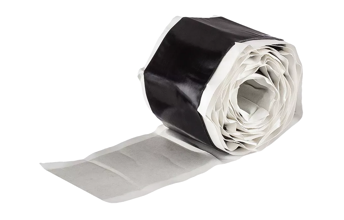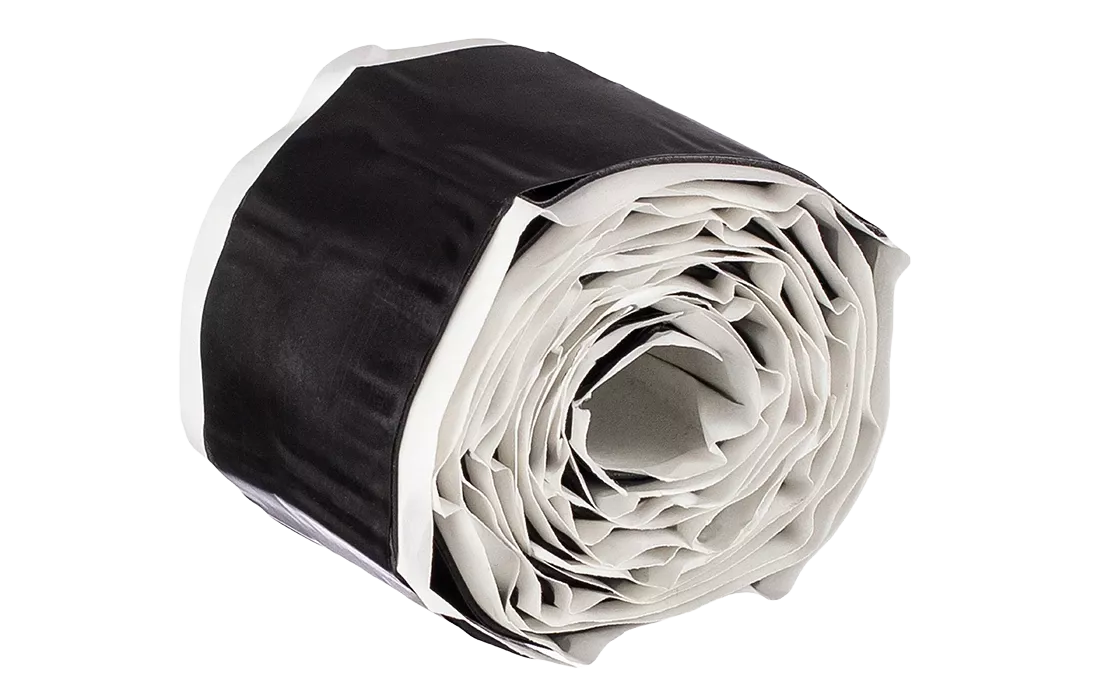 Лента герметизирующая на полиэтиленовой основе с клеевым слоем постоянной липкости, черного цвета, дублирована одним слоем силикононизированной бумаги.