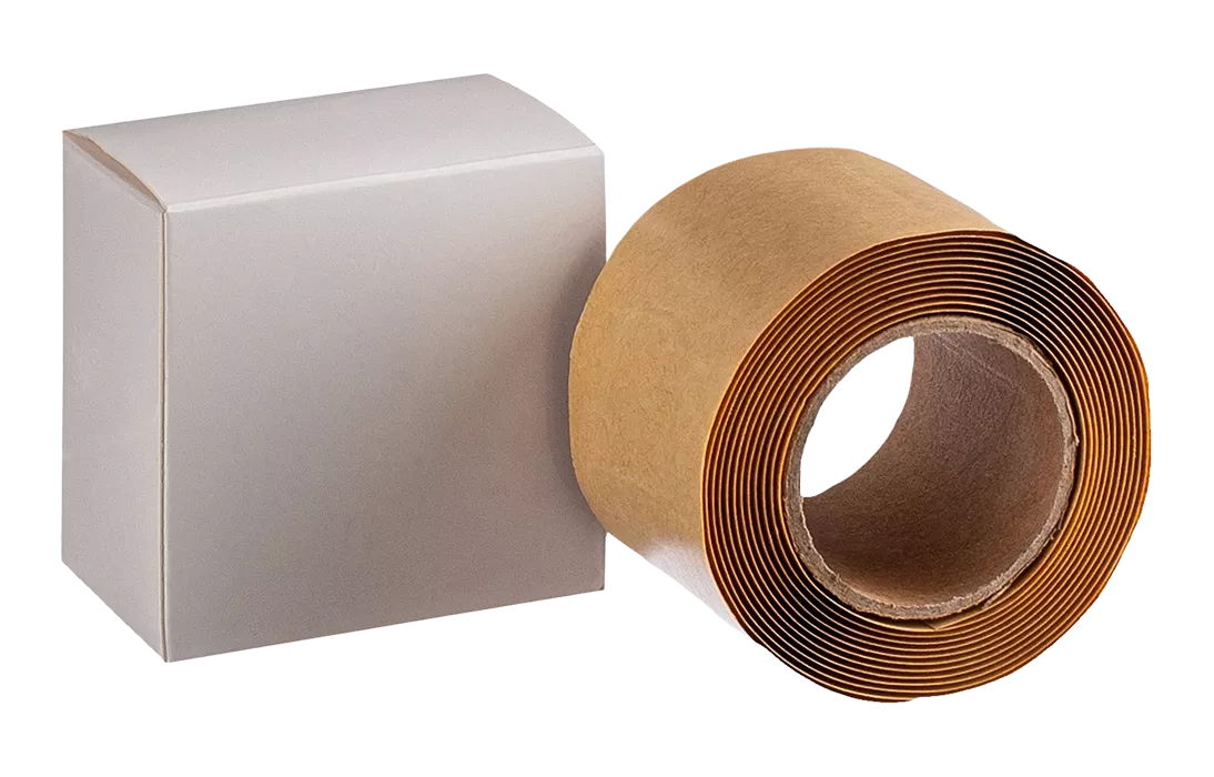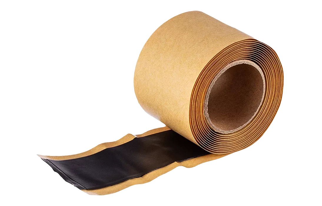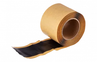 Лента герметизирующая на полиэтиленовой основе с клеевым слоем постоянной липкости, черного цвета, дублирована одним слоем силикононизированной бумаги.