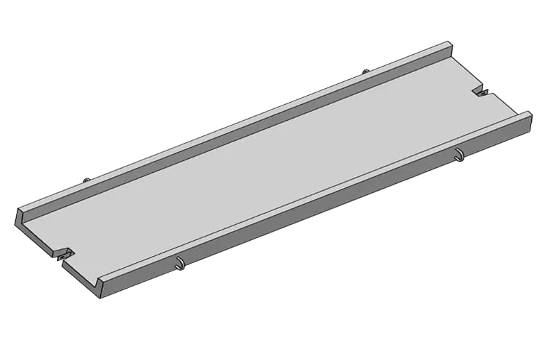 Лоток имеет внутреннюю арматуру – экран, выполненный из стального арматурного прутка в виде сетки с выводами из бетона, для соединения экранов соседних лотков и крышек.