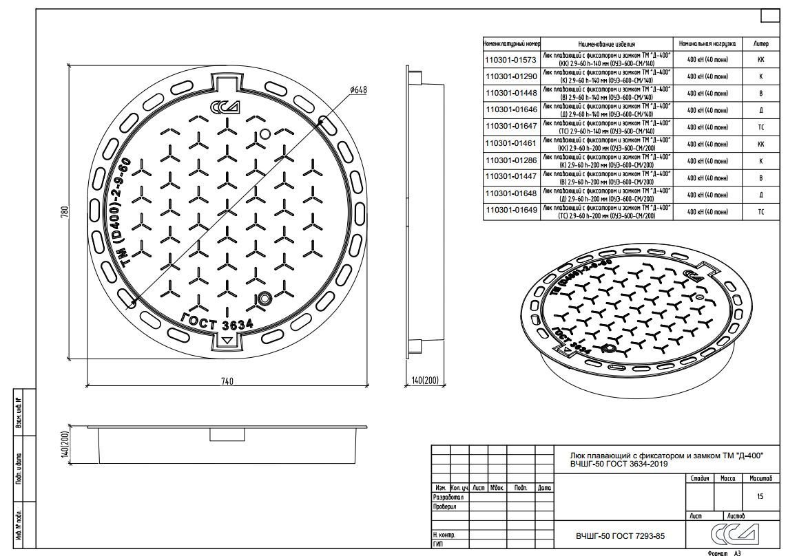 Люки отливаются из чугуна марки «ВЧ-50» согласно EN - GJS-500-7 и изготавливаются согласно ГОСТ 3634-99 — «Люки смотровых колодцев и дождеприемники ливнесточных колодцев (европейский стандарт EN 124-1994)». Дополнительная информация о люках и их маркировке приведена в описании группы.