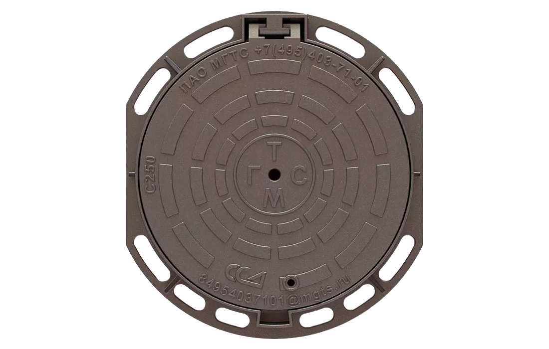 На нерифлёной части наружной стороны верхней крышки люка отлиты буквы "ПАО МГТС", телефонный номер "+7 (495) 403-71-01" и адрес электронной почты "84954037101@mgts.ru".