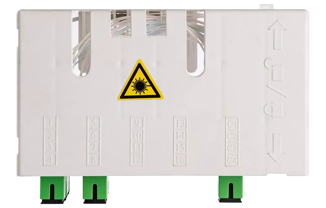 Конструкция модуля позволяет установить PLC разветвители, оконцованные разъёмами SC типа: два 1х8 или один 1х16. При этом как входные, так и выходные разъёмы разветвителей будут подключены к адаптерам модуля.