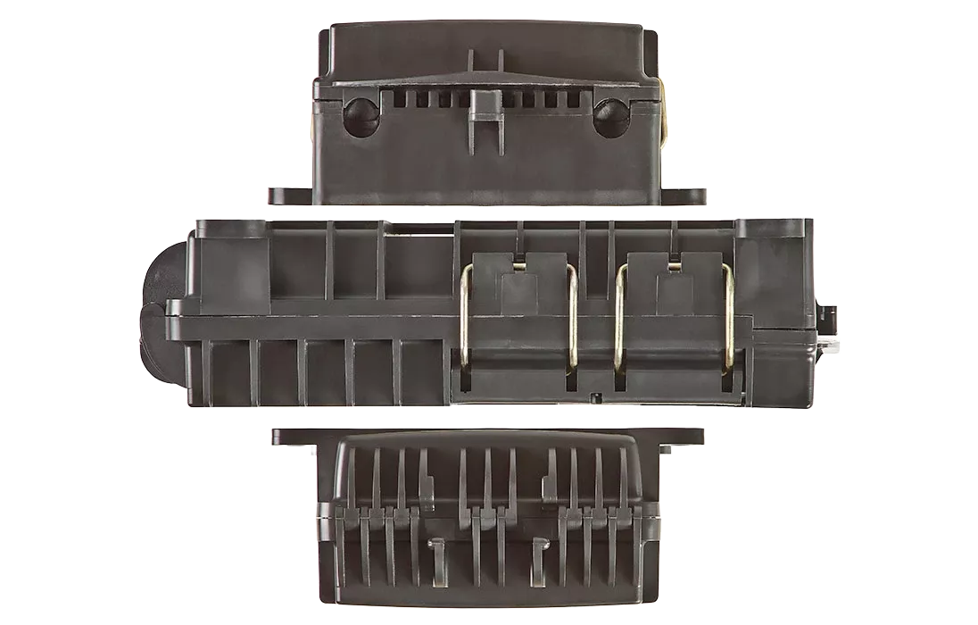 • пылезащищенный вывод до 10 дроп-кабелей круглого профиля диаметром до 5 мм или прямоугольного профиля типа «бабочка».