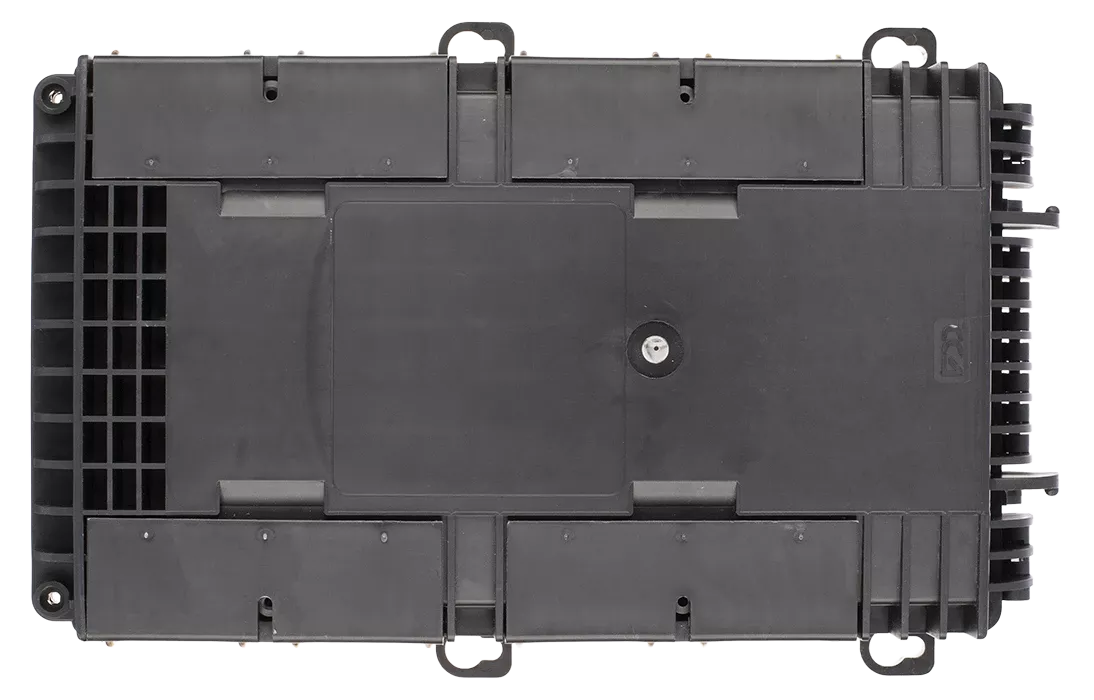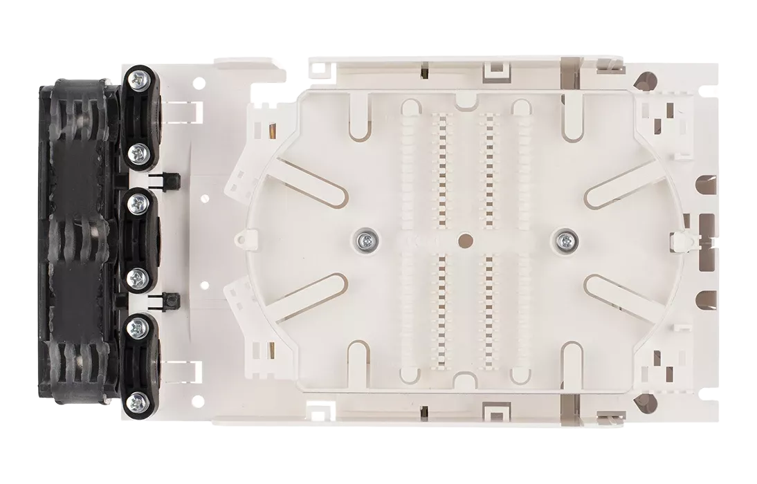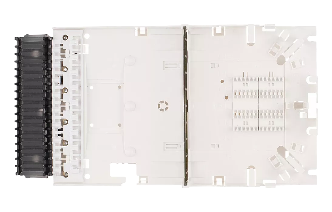 Внутри корпуса установлена съёмная монтажная панель (вставка), с тыльной стороны которой предусмотрено место для укладки транзитной петли оптических модулей, установлены фиксаторы ЦСЭ и кассеты для сварки волокон распределительных ВОК, а также ложементы, на который можно установить разветвители в мини-корпусах с волокнами в буферном покрытии 900 мкм. Предусмотрена установка двух разветвителей в мини-корпусах 1х8 -PLC -SM/0,9 -1,0 м-SC/APC или четырёх разветвителей 1х4 -PLC -SM/0,9 -1,0 м-SC/APC или одного разветвителя 1х16 -PLC -SM/0,9 -1,0 м-SC/APC. На лицевой стороне панели расположена планка для адаптеров SC типа и ложементы Л12-4525 для размещения сварных стыков абонентских дроп-кабелей с пигтейлами. Место размещения сварных соединений дроп-кабелей защищено специальной пластиковой крышкой.