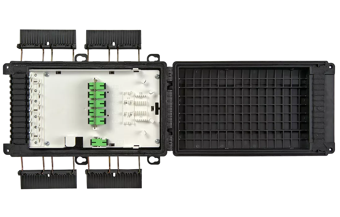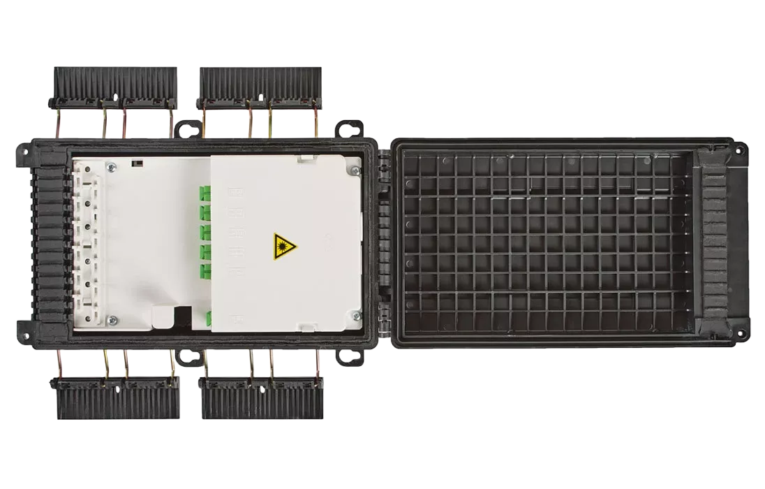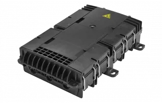 Выполнена из пластмассы и имеет пыле-брызгозащищенную тупиковую конструкцию (ввод ОК и вывод абонентских дроп-кабелей производится с одной стороны).