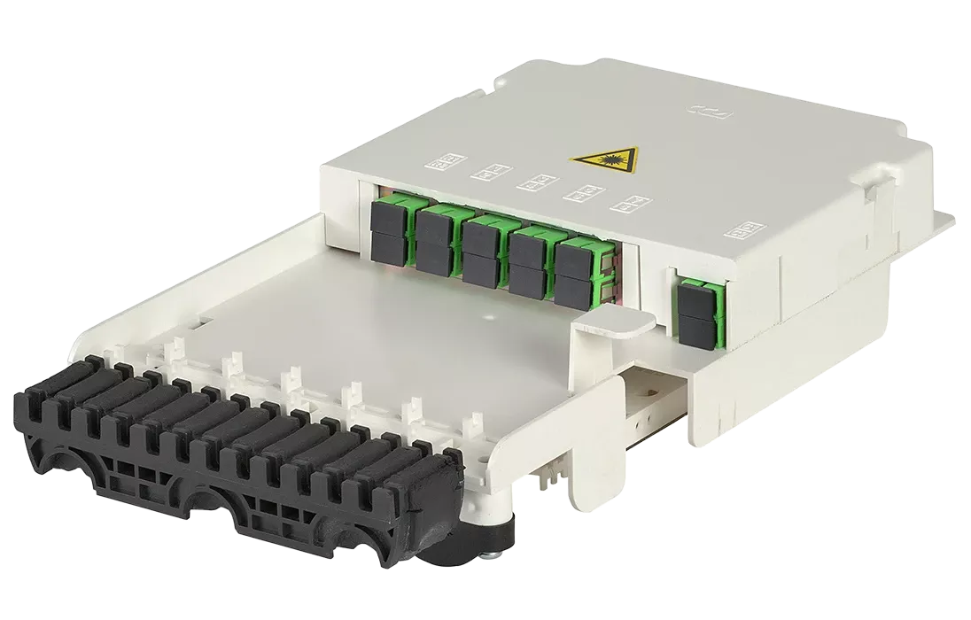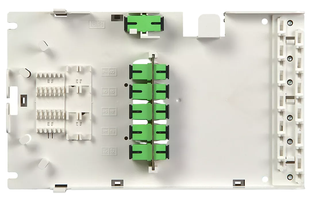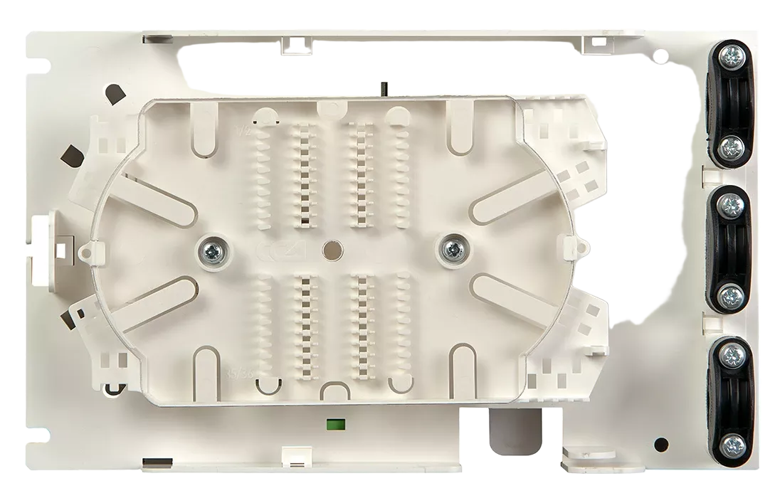 Внутри корпуса установлена съёмная монтажная панель (вставка), с тыльной стороны которой предусмотрено место для укладки транзитной петли оптических модулей, установлены фиксаторы ЦСЭ и кассета КТ-3645 для сварки волокон распределительных ВОК. На лицевой стороне панели находятся гнёзда для установки адаптеров типа SC, а также ложемент Л2-СП, на который можно установить разветвители в мини-корпусах с волокнами длиной 1 метр в буферном покрытии 900 мкм и ложемент Л12-4525 для размещения сварных стыков абонентских дроп-кабелей с пигтейлами. Предусмотрена установка одного разветвителя РО-1х8 -PLC -SM/0,9 -1,0 м-SC/APC или двух разветвителей РО-1х4 -PLC -SM/0,9 -1,0 м-SC/APC, оконцованных разъемами SC. Место размещения сплиттеров и сварных соединений дроп-кабелей защищено специальной пластиковой крышкой.