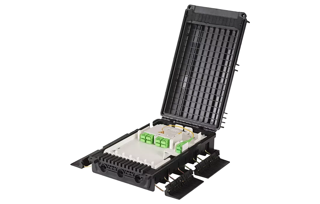 Выполнена из пластмассы и имеет пыле-брызгозащищенную тупиковую конструкцию (ввод ОК и вывод абонентских дроп-кабелей производится с одной стороны).