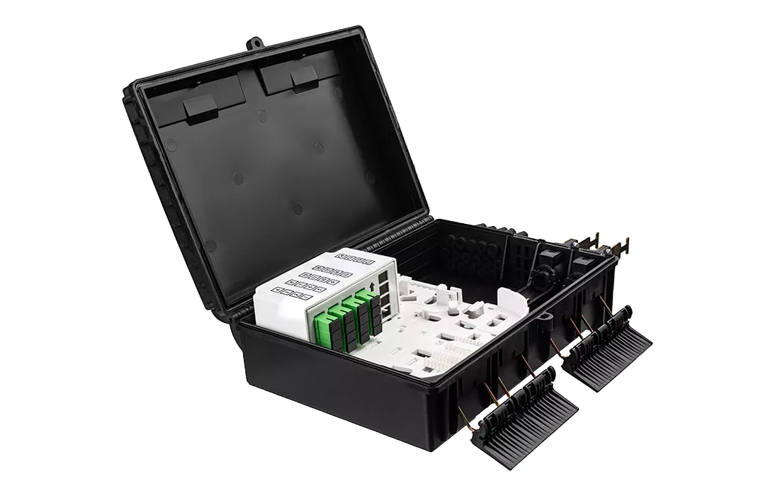 Выполнена из устойчивого к атмосферным воздействиям, УФ стойкого пластика и имеет пыле-влагозащищенную тупиковую конструкцию (ввод ОК и вывод абонентских дроп-кабелей производится с одной стороны).