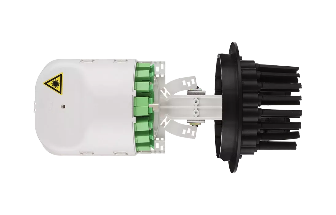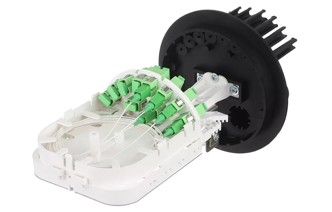 В обновлённой конструкции муфты установлен внутренний лоток-кассета с литым ложементом для 48 сварных соединений, а так же специальный сплиттерный модуль СМ4, в который, в данной комплектации уже установлены 10 адаптеров SC-типа и один PLC разветвитель 1х4.
