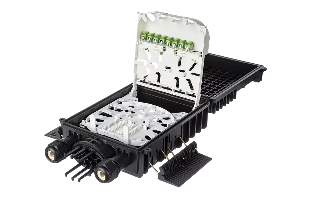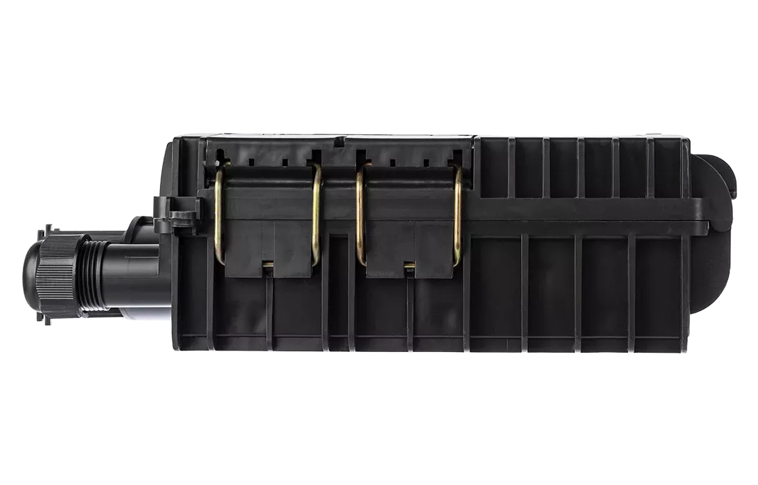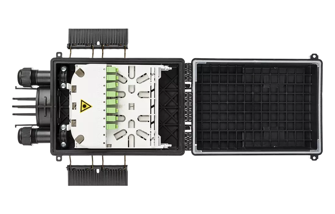 Выполнена из пластмассы и имеет пыле-брызгозащищенную конструкцию (ввод ОК и вывод абонентских дроп-кабелей производится с одной стороны).