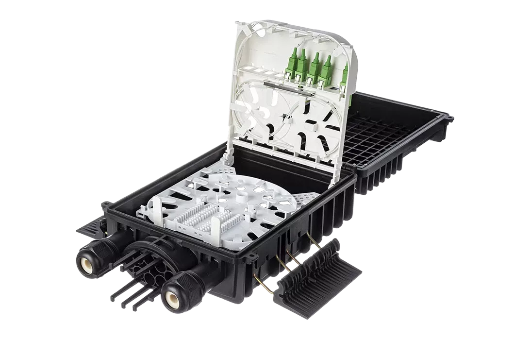Выполнена из пластмассы и имеет пыле-брызгозащищенную конструкцию (ввод ОК и вывод абонентских дроп-кабелей производится с одной стороны).