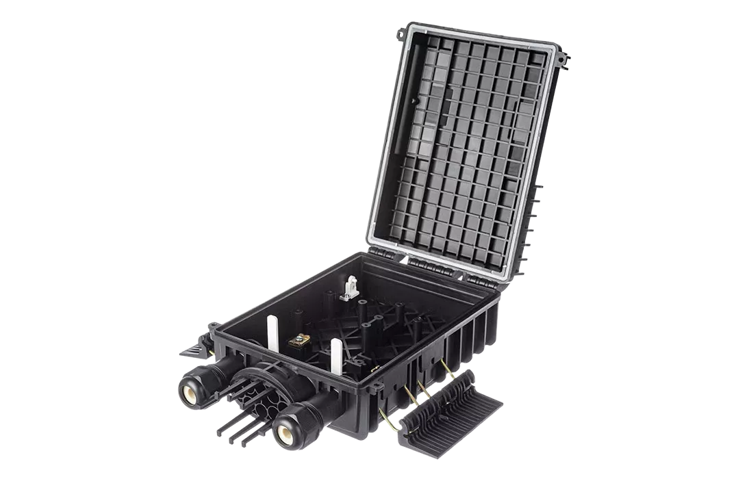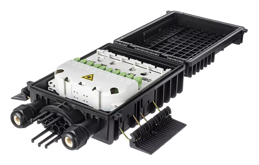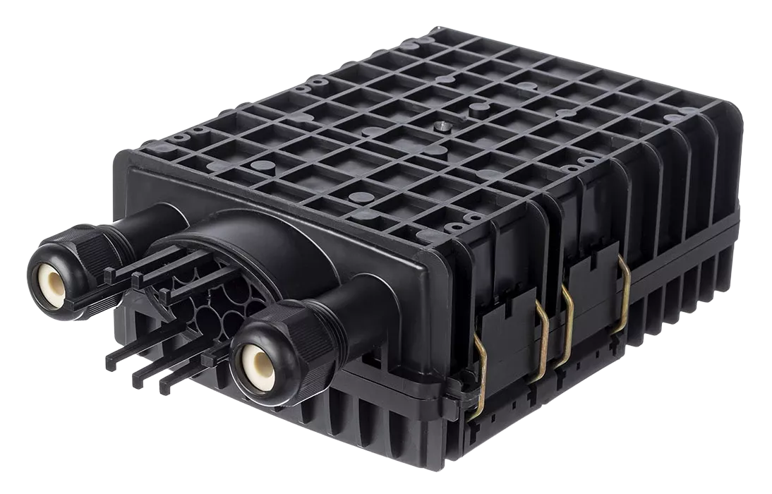 Выполнена из пластмассы и имеет пыле-брызгозащищенную конструкцию (ввод ОК и вывод абонентских дроп-кабелей производится с одной стороны).