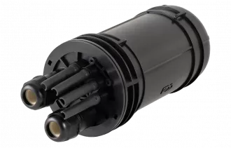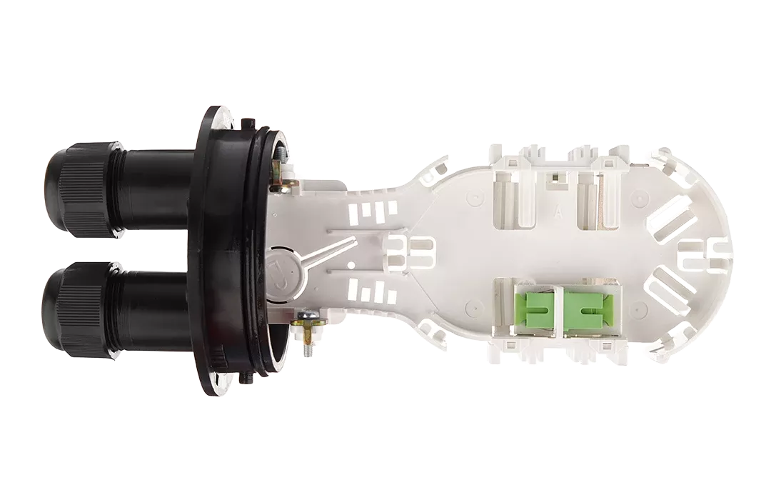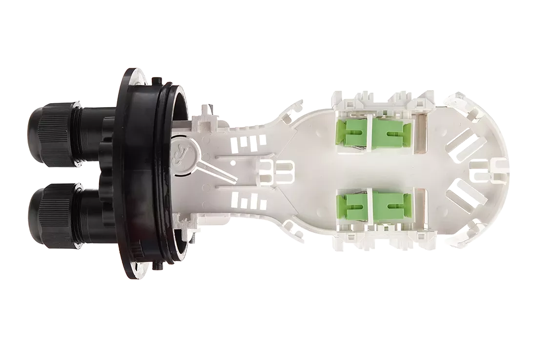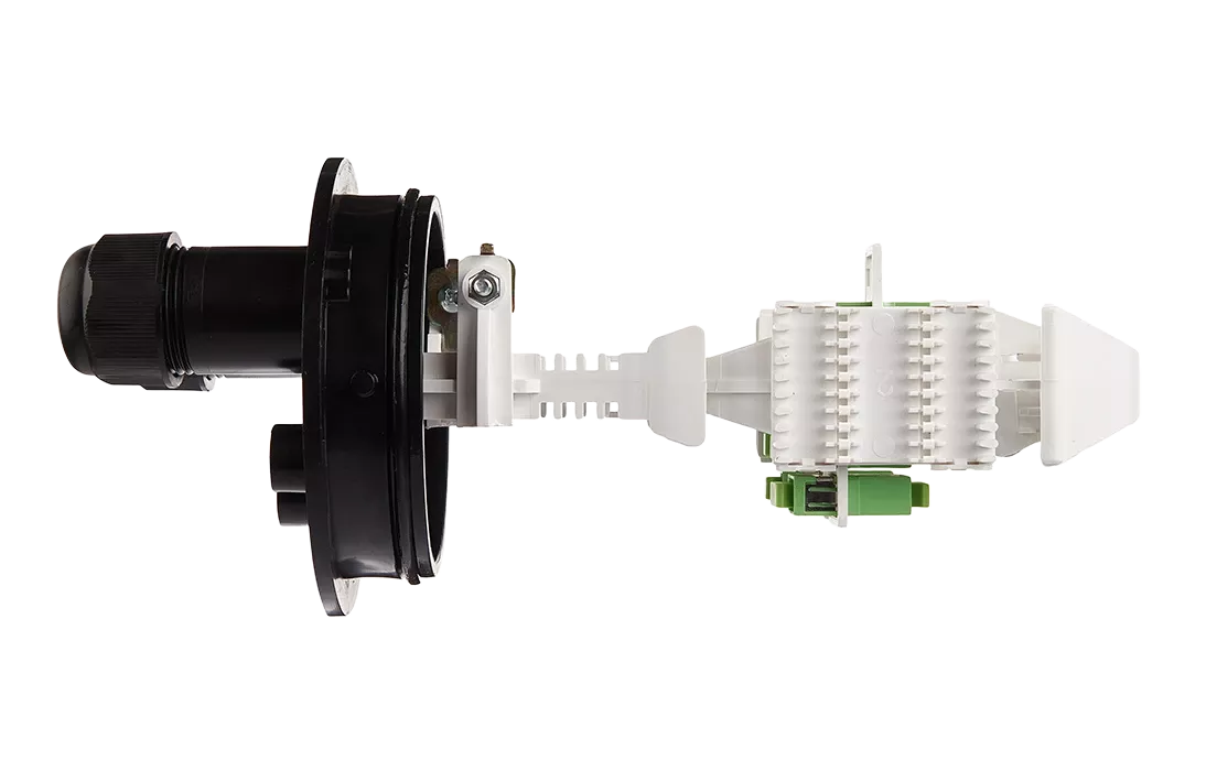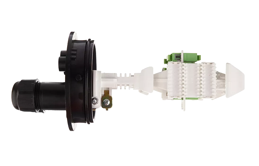 Ввод абонентских дроп-кабелей осуществляется с помощью проходных отверстий на оголовнике, диаметр которых позволяет вводить в муфту дроп-кабели с разъемами SC типа. Герметизация вводов достигается с помощью разрезных эластичных втулок (заглушек).