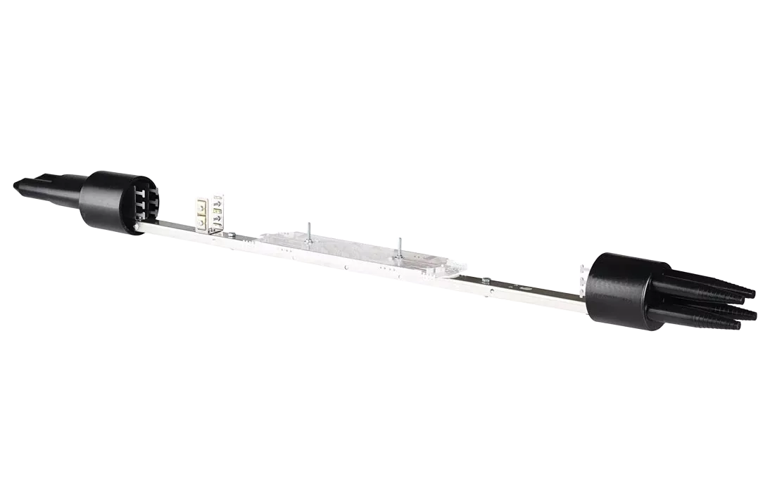 В муфте предусмотрен овальный ввод для транзитной петли оптических модулей без разрезания. Выкладка петли модулей осуществляется на лотке с противоположной стороны от кассет.