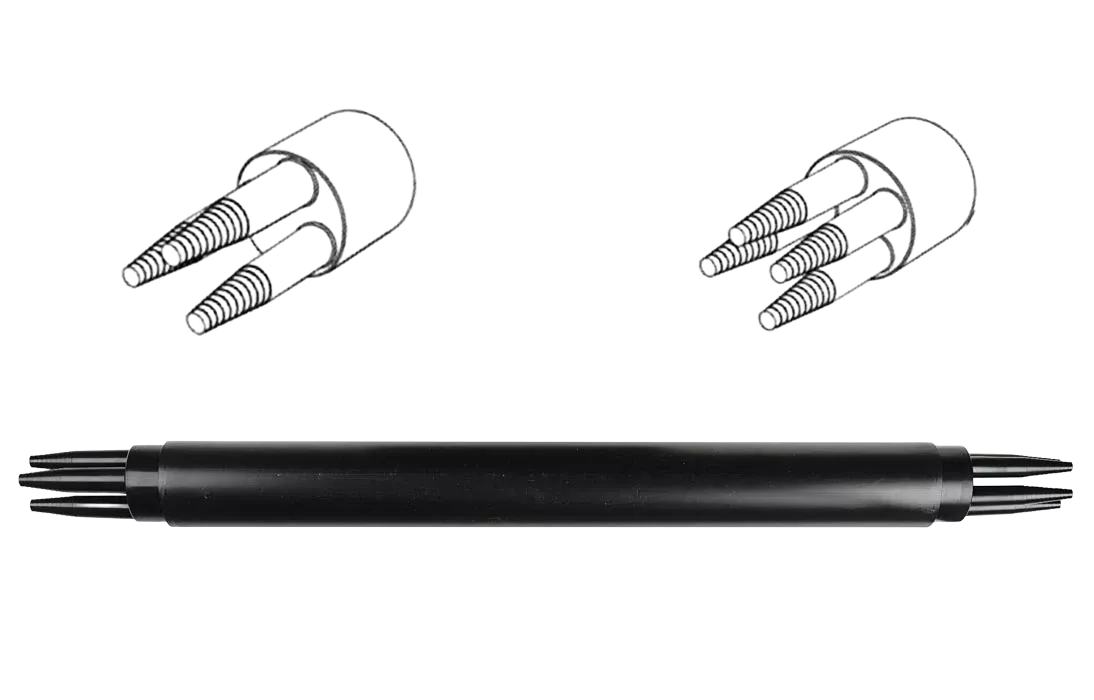 Способ герметизации вводов кабелей, осуществляется с помощью термоусаживаемых трубок ТУТ. Круглые патрубки на оголовнике муфты изначально герметичны и имеют ступенчатую форму с разными диаметрами. Срезая патрубок в определенном месте можно подобрать отверстие максимально близкое к диаметру вводимого кабеля. Таким образом, исключается излишнее натяжение ТУТ после усадки при вводе относительно тонких кабелей. Все патрубки муфты оснащены также индивидуальными узлами крепления ЦСЭ.