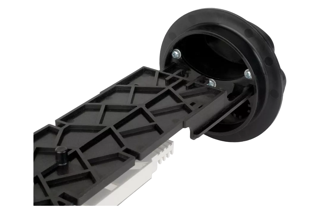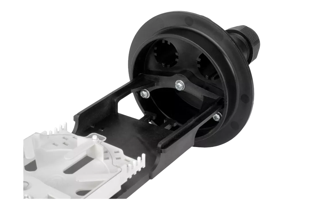 Ввод кабеля, крепление и герметизация осуществляется с помощью резьбовых фитингов, отлитых непосредственно на оголовнике муфты. Муфта имеет два круглых патрубка с фитингами и один овальный, герметизация вводимых кабелей осуществляется также механическим способом. Используя специальные комплекты для ввода в овальный патрубок можно ввести как два отдельных кабеля, так и транзитный. Заглушка овального ввода выламывается при помощи молотка.