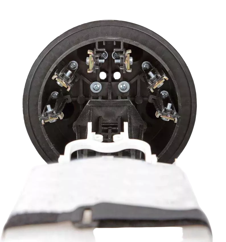 Способ герметизации вводов кабелей, осуществляется с помощью термоусаживаемых трубок ТУТ. Круглые патрубки на оголовнике муфты изначально герметичны и имеют ступенчатую форму с разными диаметрами. Срезая патрубок в определенном месте можно подобрать отверстие максимально близкое к диаметру вводимого кабеля. Таким образом, исключается излишнее натяжение ТУТ после усадки при вводе относительно тонких кабелей. Все патрубки муфты оснащены также индивидуальными узлами крепления ЦСЭ.