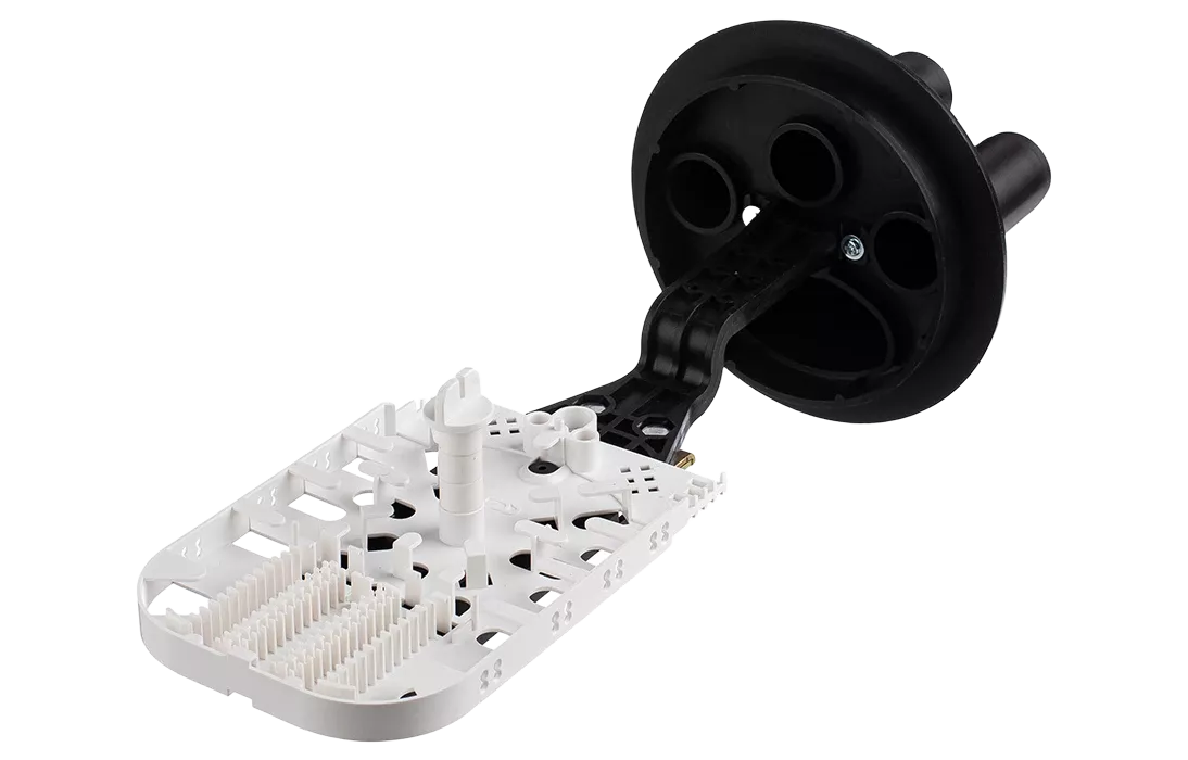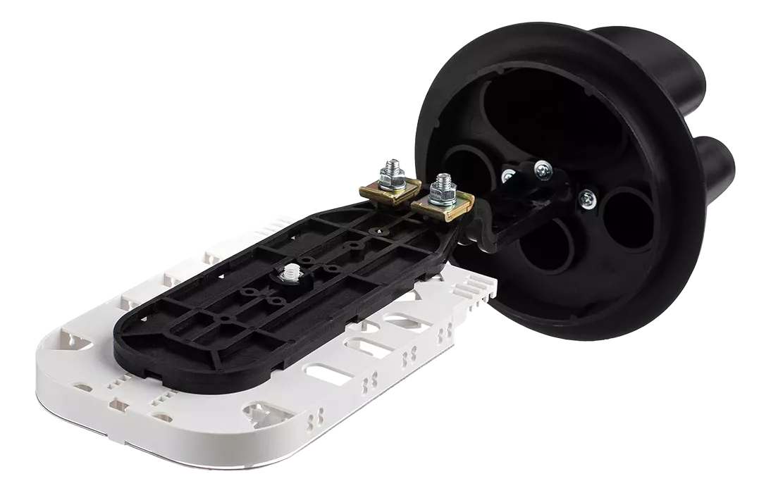 Внутри муфты установлен лоток с кассетой КС-4845 с литым ложементом для 48 сварных соединений, конструкция кассеты позволяет произвести установку до двух оптических планарных мини-разветвителей (с размерами корпуса 60х7х4 мм.), заводить модули с ОВ с двух углов и осуществлять изменение направления укладки запаса волокон.