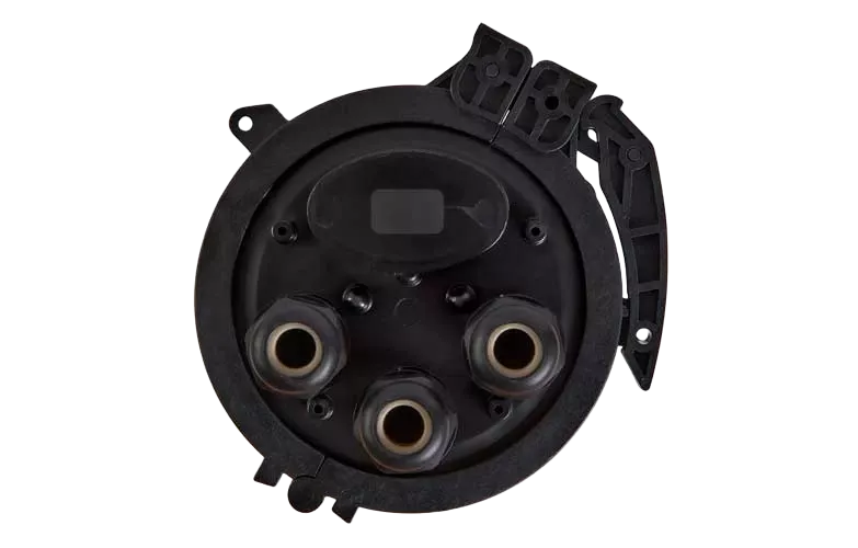 Ввод кабеля, крепление и герметизация осуществляется с помощью резьбовых фитингов, отлитых непосредственно на оголовнике муфты. Муфта имеет три круглых патрубка с фитингами и один овальный, герметизация вводимых кабелей осуществляется также механическим способом. Используя специальные комплекты для ввода в овальный патрубок можно ввести как два отдельных кабеля, так и транзитный. Заглушка овального ввода выламывается при помощи молотка.