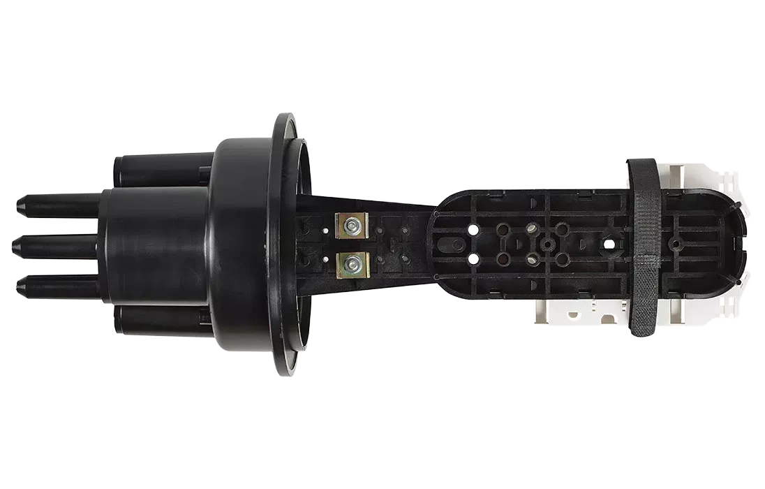 В муфте предусмотрен овальный ввод для транзитной петли оптических модулей без разрезания. Выкладка петли модулей осуществляется на лотке с противоположной стороны от кассет.