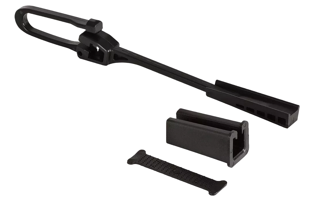 Состоит из открытого корпуса с ребристой контактной поверхностью, клина с петлей и вставки, которая прокладывается между кабелем и клином. Конструкция зажима обеспечивает прочное крепление кабеля. Материал изделия – полиамид, стойкий к ультрофиолету.