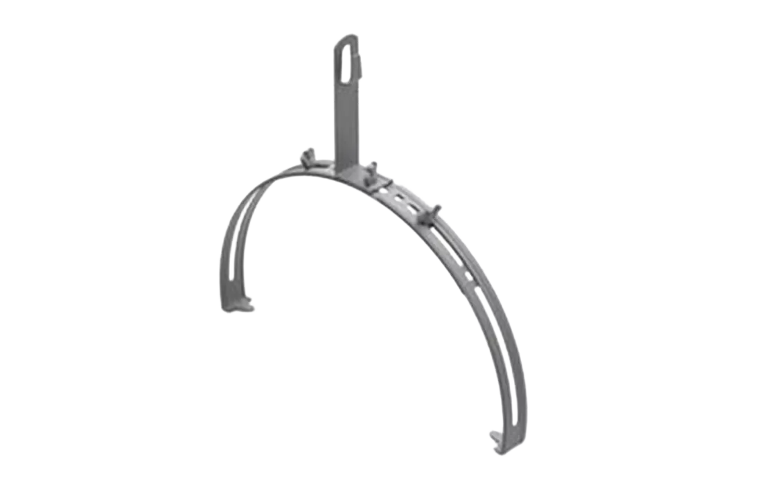 Регулируемый коньковый зажим используется для фиксации молниеприемной сетки на круглом коньке кровли. Проводник крепится безвинтовым зажимом с применением плоскогубцев. Диапазон зажима – от 240 до 300 мм. Изготовлен из горячеоцинкованной стали.