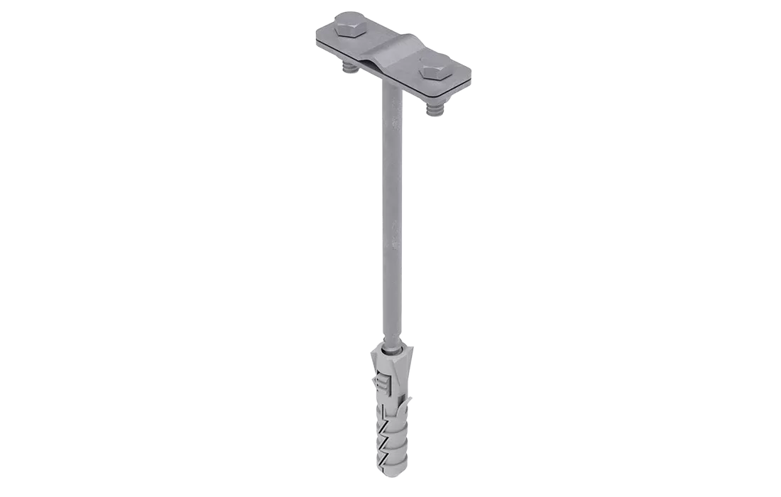 Фасадный держатель используется для крепления круглых (8-10 мм) и плоских (25-40 мм) токоотводов по фасаду здания. Способ крепления проводника - болтовой зажим. Длина – 160 мм, изготовлен из горячеоцинкованной стали.