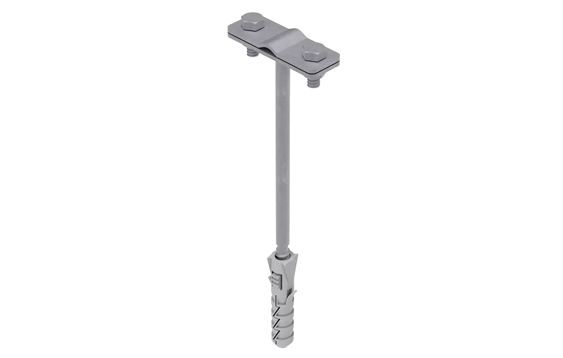 Фасадный держатель применяется для крепления круглых (8-10 мм) и плоских (25-40 мм) токоотводов по фасаду здания. Способ крепления проводника - болтовой зажим. Длина – 160 мм, изготовлен из горячеоцинкованной стали.