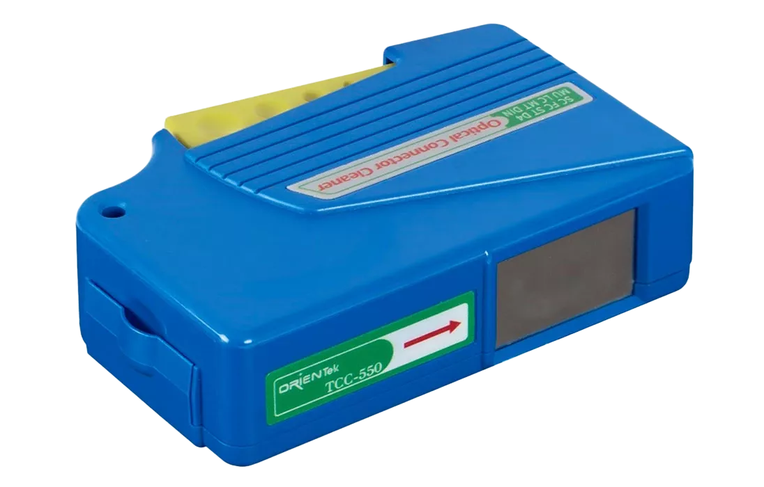Очиститель оптических коннекторов многоразовый TCC-550 предназначен для чистки их торцевой поверхности. Нажатием кнопки в TCC-550 производится прокручивание чистящей ленты на «чистый» сегмент и одновременное открытие защитной шторки, приводя очиститель в состояние готовности к работе. Рассчитано на чистку до 500 коннекторов с одной сменной лентой. TCC-550 предназначен для чистки коннекторов диаметром 2.5 мм (FC, SC, ST разъемы) и 1.25 мм (LC, MU разъемы).