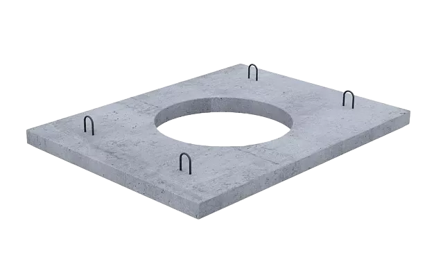 Плита имеет прямоугольную форму, в центре которой расположено круглое отверстие диаметром 600 мм, для формирования горловины с люком. На верхней поверхности плиты, с четырех сторон располагаются петли для строповки.