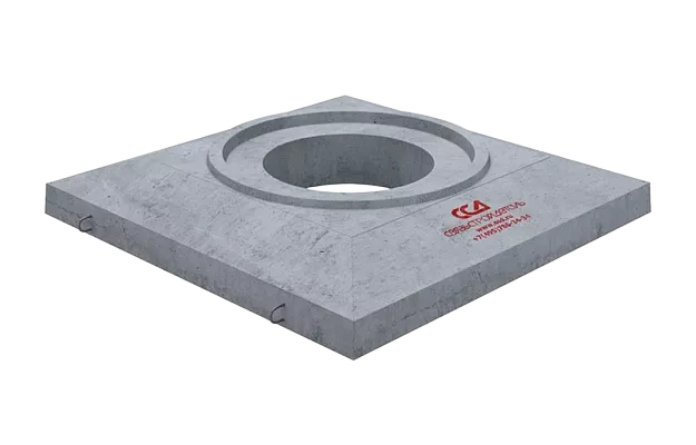 Плита имеет квадратную форму с центрально расположенным круглым отверстием для установки люка. На верхней поверхности плиты расположены четыре строповочных петли. Отверстие снизу плиты имеет диаметр 600 мм. Это создает возможность ввода горловины пластикового колодца внутрь отверстия плиты, с последующим размещением пластиковой крышки колодца или чехла на горловине колодца для дополнительной защиты от воды и грязи. Чтобы исключить давление плиты на горловину колодца при проседании грунта после строительства, ее следует вводить не более чем на треть высоты отверстия плиты.