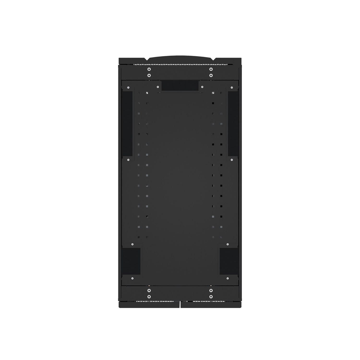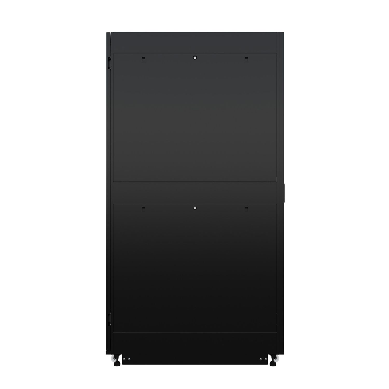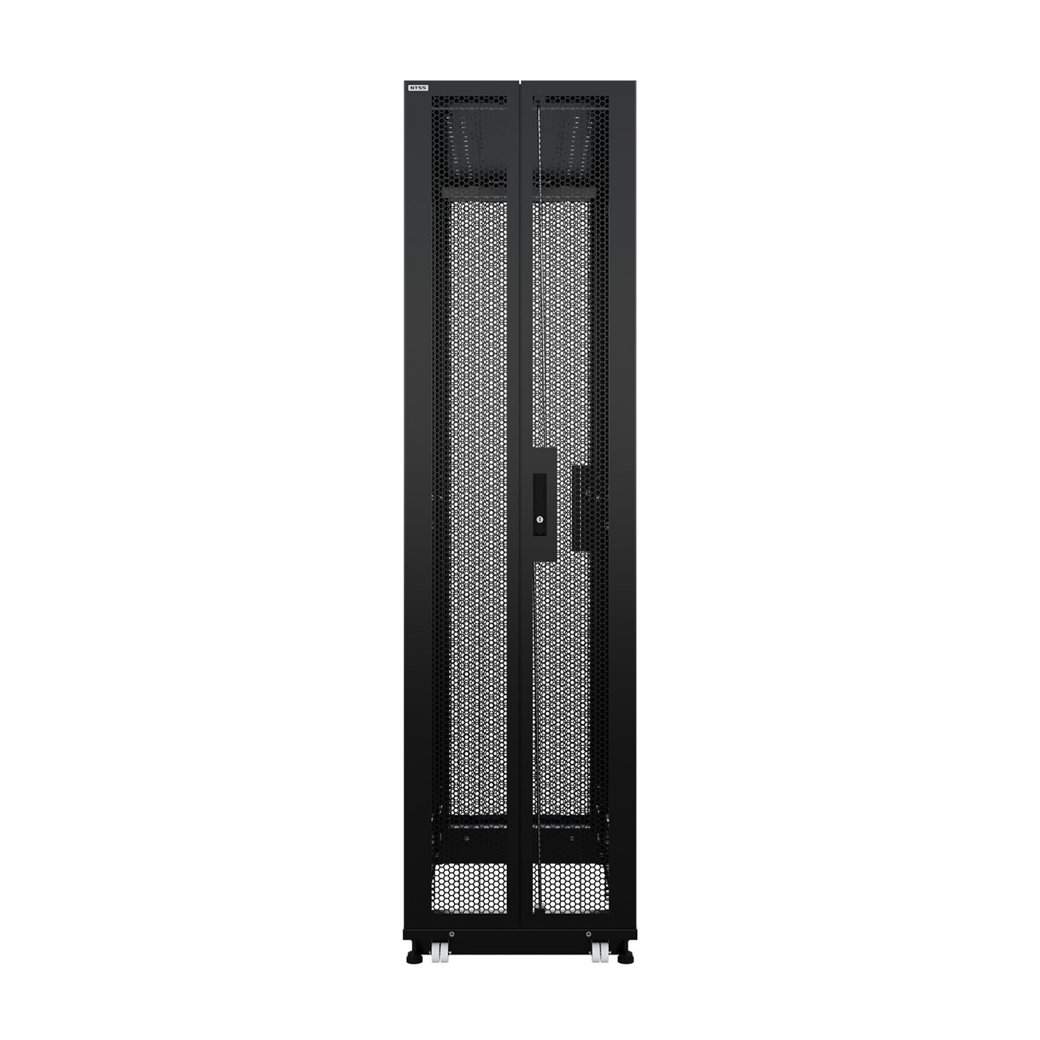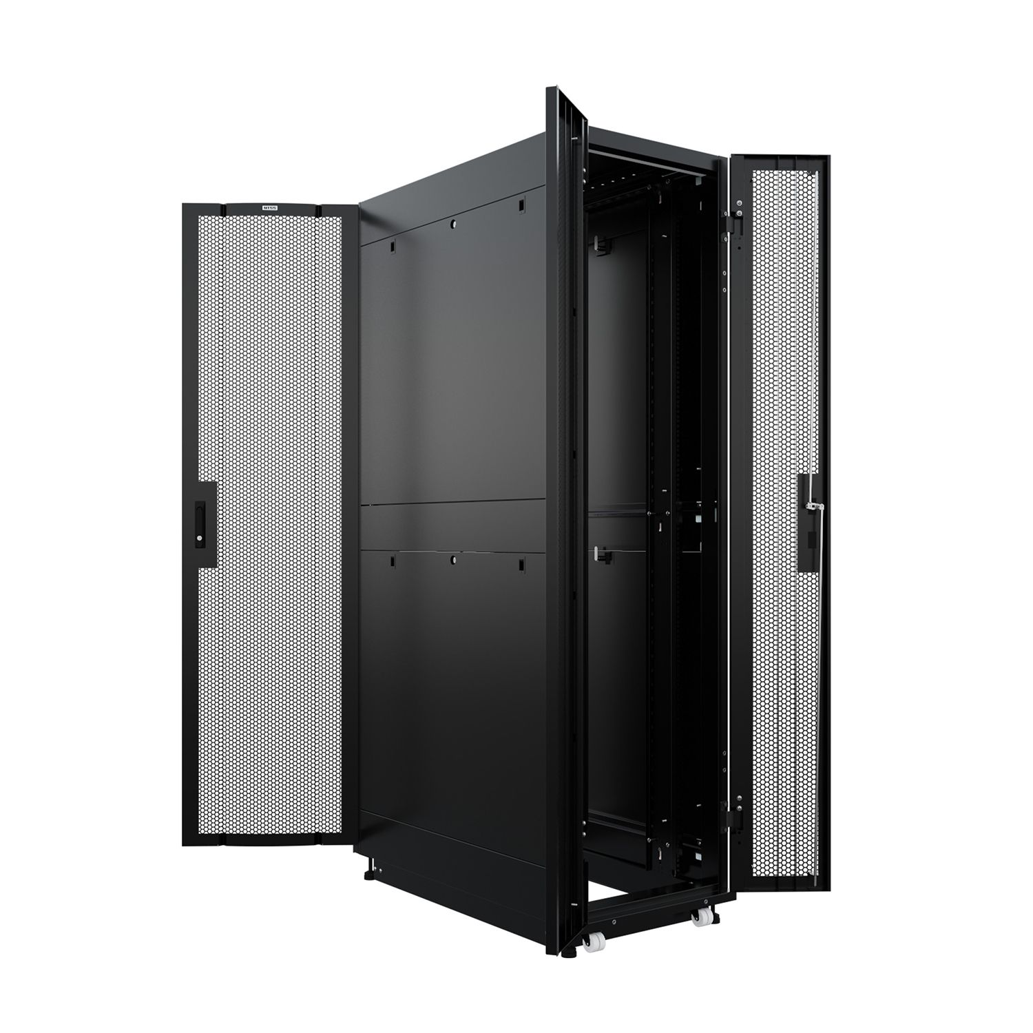 Угол открытия перфорированных передних и задних дверей 180°. Может эксплуатироваться без боковых панелей с полным сохранением функционала. По желанию шкафы могут устанавливаться без ножек и роликов для уменьшения высоты инсталляции без потери нагрузочной способности.