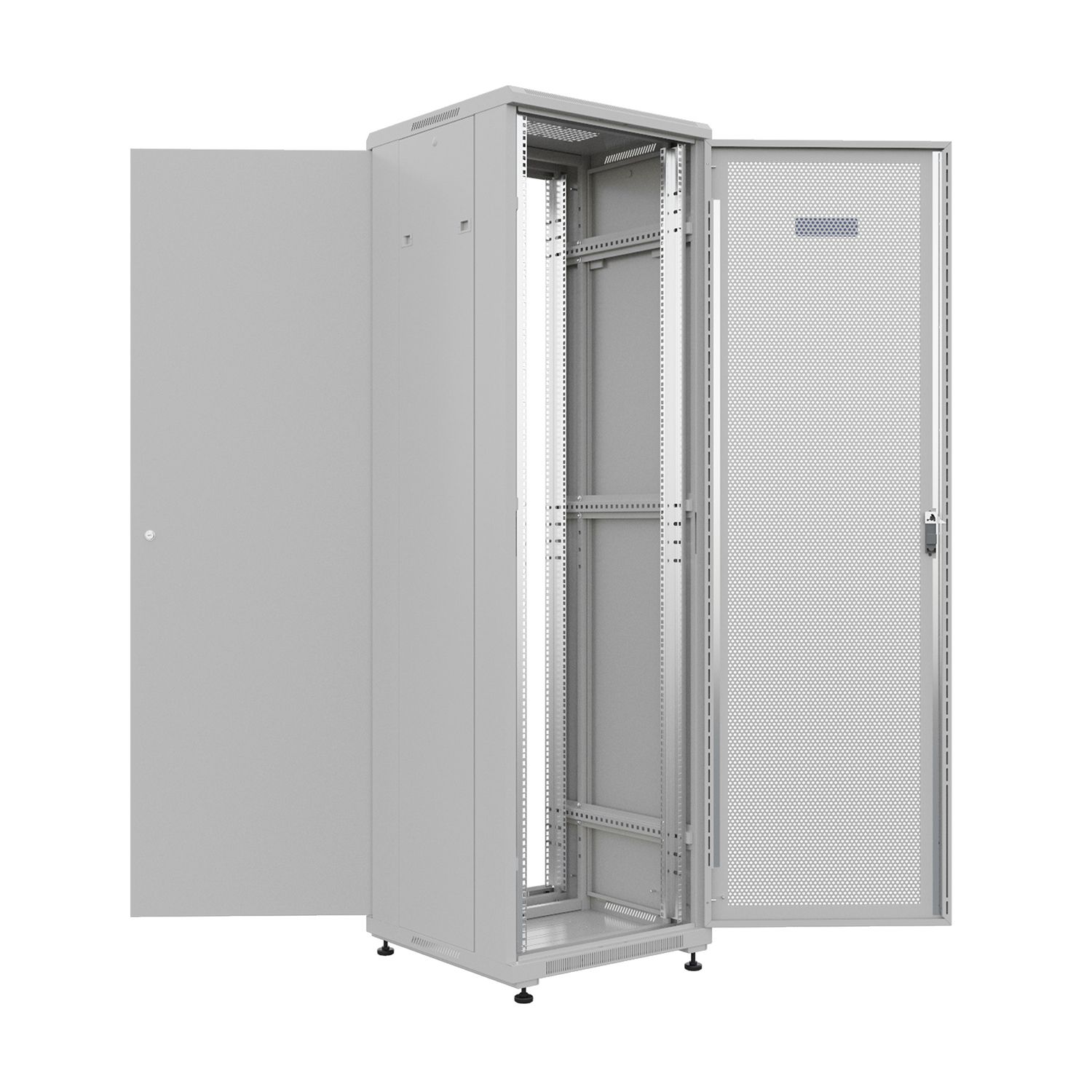Шкаф напольный универсальный серверный NTSS R 42U 600х600мм, 4 профиля 19, двери перфорированная и сплошная металл, боковые стенки съемные, регулируемые опоры, разобранный, серый RAL 7035