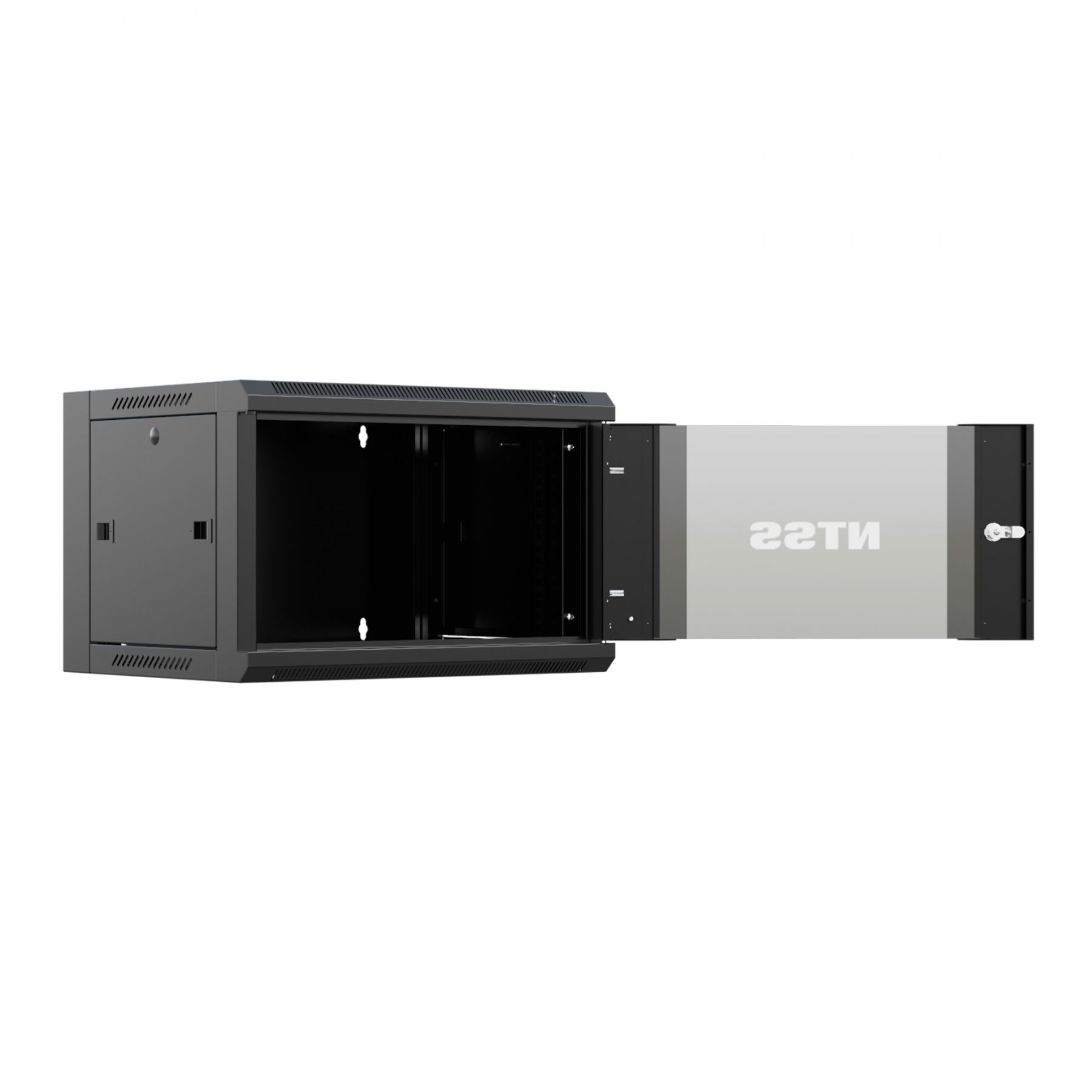 Компактный разобранный настенный шкаф NTSS серии «W» с передней дверью, открываемыми боковыми стенками на защелках, задней стенкой и панелями пола и потолка. В комплекте 1 пара 19” профилей, уголки для поддержки оборудования.