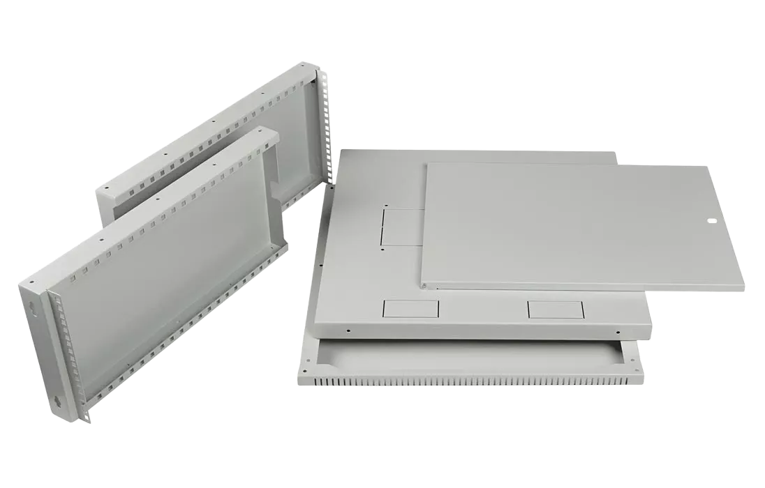 Имеет полностью разборную конструкцию и состоит из шести основных частей: крыша, дно, две боковые стенки с вертикальными направляющими, дверь, задняя стенка* и две передние направляющие. За счет элементов крепления каркас шкафа имеет повышенную жесткость. Комплектация шкафа возможна с несколькими исполнениями двери-металлической, перфорированной и с каленым ударопрочным, тонированным стеклом. Предусмотрены два кабельных ввода в верхней и нижней частях шкафа, размер – 100х50 мм. В основание или крышу шкафа возможна установка вентиляторного модуля. Для установки модуля демонтируется заглушка, и модуль фиксируется шестью винтами. Вертикальные направляющие регулируются по глубине. Система заземления шкафа входит в стандартную комплектацию.